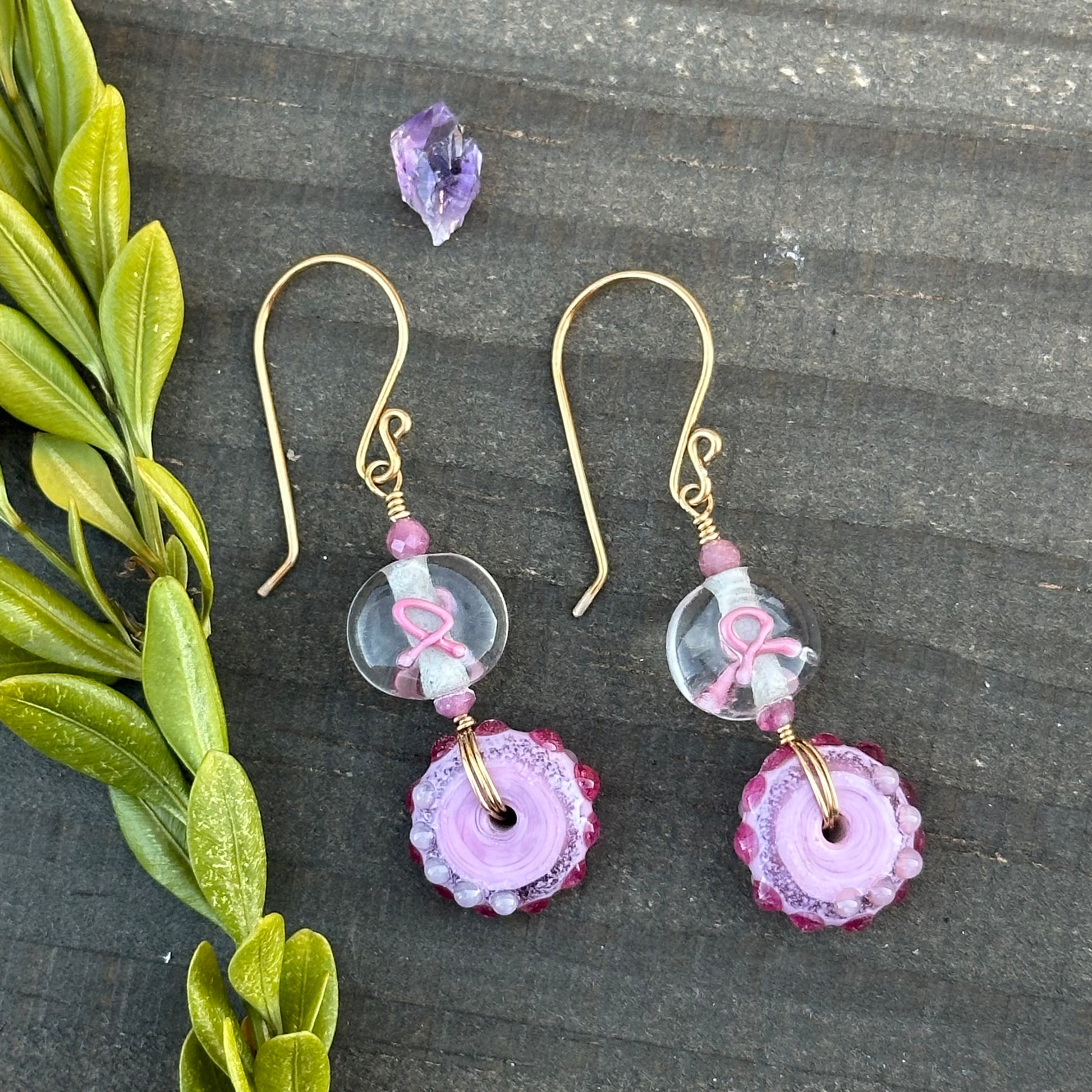 Pink Ribbon Earrings with Artisan Glass, Brass, and Pink Tourmaline